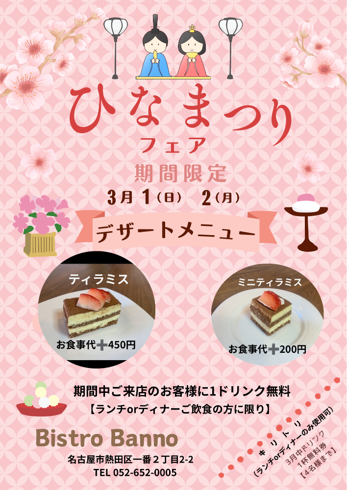 いつもBistro Bannoをご利用頂き誠にありがとうございます🙇♀️ ひなまつりフェアのお知らせです🎎 3月3日(火)ひなまつり🎎 今年は当店の定休日と重なってしまったので、 3月1日(日)・2日(月)の二日間で開催致します🌸 期間限定でランチorディナーご飲食の方に限り ティラミス➕450円、ミニティラミス➕200円でケーキを提供させていただきます🍓 是非、この機会にご賞味ください✨ 期間中、ご来店頂いたお客様へInstagramフォローこちらの画面の表示で1ドリンク無料とさせて頂きます🥤 皆様のご来店を心よりお待ち致しております🙇♀️ |