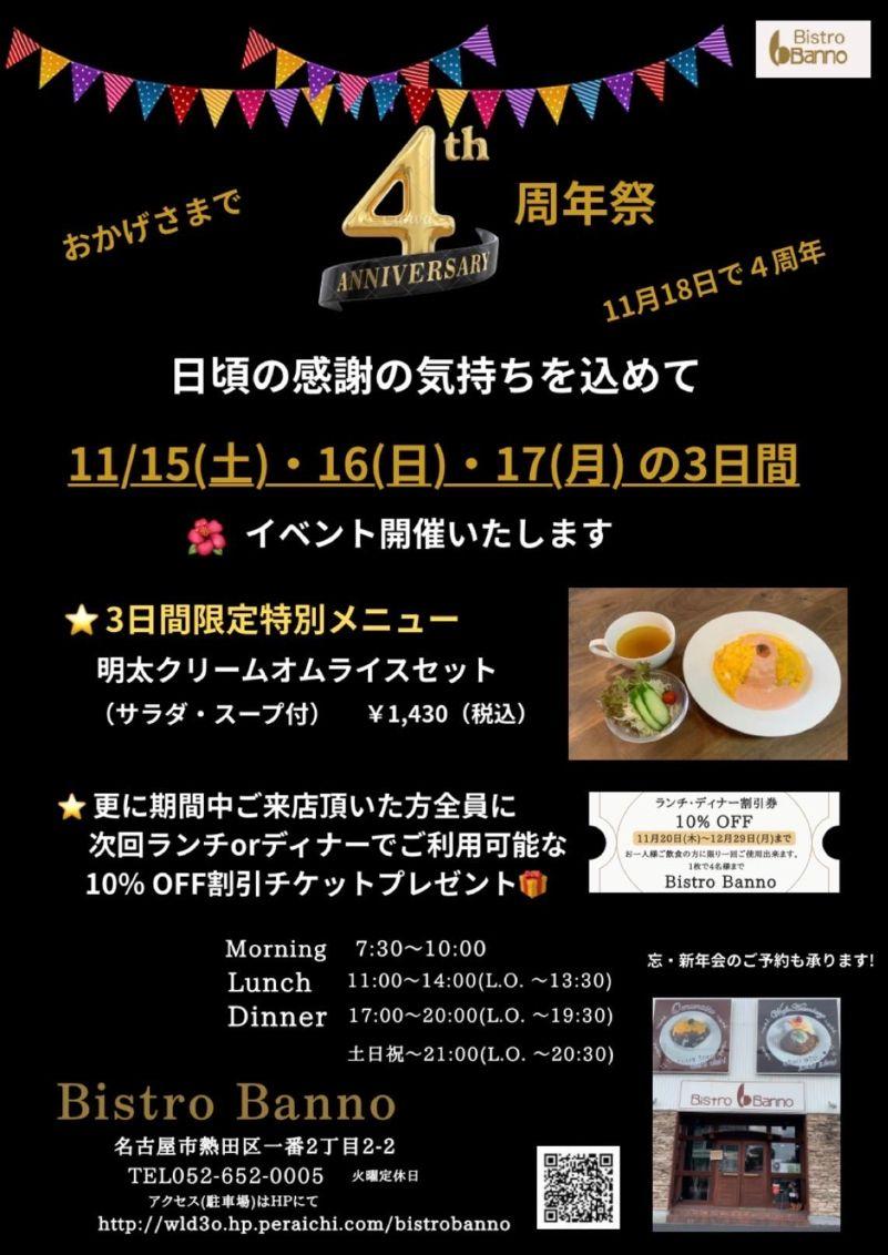 いつもBistro Bannoをご利用頂き誠にありがとうございます🙇♀️ 🏳️🌈四周年祭のお知らせです🎉 この度、Bistro Bannoは2025.11.18で4周年を迎える事となりました💐 これもひとえにご来店いただきましたお客様の支えがあったからこそと深く感謝しております🙇♀️ 今後とも皆様に美味しいお料理とサービスをご満足頂ける様、精進してまいりますのでよろしくお願い致します🤲 日頃の感謝の気持ちを込めまして✨ 11/15(土)・16(日)・17日(月)の三日間限定で特別メニューとして明太クリームオムライスセット(サラダ+スープ付)を税込1,430円でご用意させていただきます🥄 皆様、是非この機会にご賞味ください✨ 更に期間中ご来店頂いた方全員に次回ランチorディナーでご利用可能な10%OFF割引チケットをプレゼント🎁させていただきます✨ 沢山のお客様のご来店を心よりお待ち致しております🙇♀️ |