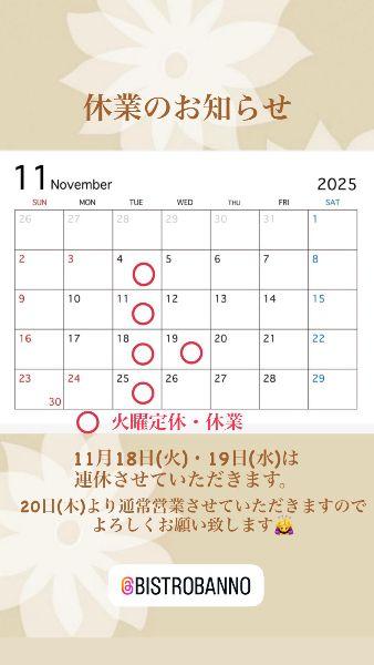 いつもBistro Bannoをご利用いただき誠にありがとうございます🙇♀️ 11月休業のお知らせです📢 11月18日(火)・19日(水)は連休させていただきます🙇♀️ 20日(木)より通常営業させていただきますのでよろしくお願い致します🙇♀️ 皆様のご来店を心よりお待ち致しております🙇♀️ |