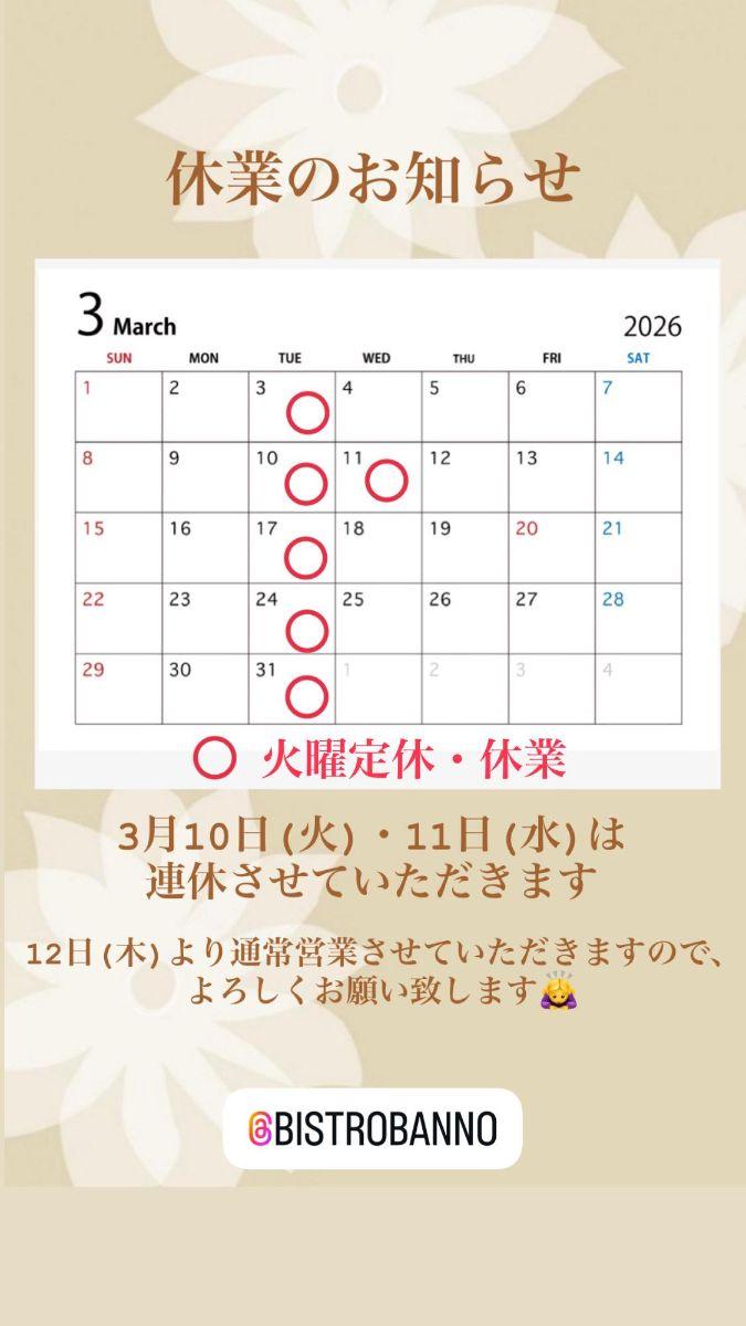 いつもBistro Bannoをご利用頂き誠にありがとうございます🙇♀️ 3月休業のお知らせです📢 3月10日(火)・11日(水)は連休させていただきます🙇♀️ 12日(木)より通常営業させていただきますので、よろしくお願い致します🤲 皆様のご来店を心よりお待ち致しております🙇♀️ |